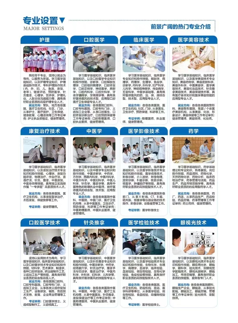 石家庄现代医学中等专业学校创办于1991年,是河北省教育厅、卫生厅、发改委批准成立的一所全日制医学专业院,是河北省考试院统招计划学校。我校面向全国招生,在全国同类院校中排名前十,毕业颁发国家承认的学历证书以及就业报到证。学校被评为国家级重点口腔教育基地先进单位 河北省特色医疗重点推广单位、河北省重点医学职业学校。学校先后与河北医科大学、华北煤炭医学院联合办学,2006年被认定为“阳光工程”就业再就业培训基地。