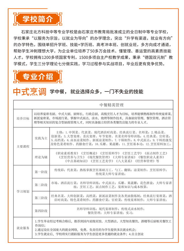 石家庄北方科技中专学校中餐厨师专业、西点烘焙专业招生简章