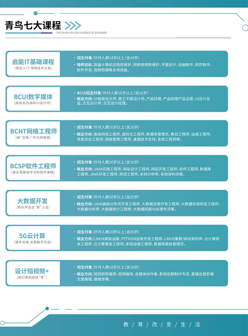 北大青鸟职业教育佳音校区专业为15岁以上人群提供全日制IT课程教育,开设的课程包含了软件开发(BCSP8.0)、网络工程(BENET6.0)、视频特效(BCVE)、UI设计(BCUI)和启蒙星3.0。