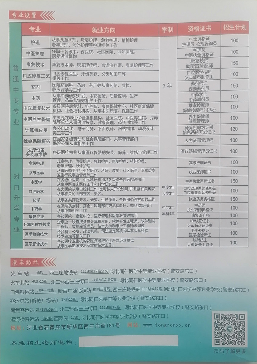 河北同仁医学中等专业学校始创于1988年,是经河北省教育厅批准而向全国计划内招生的一所省属全日医学院校,统招代码6181学校以“质量兴校,强化职业教育,管理强校,注重人文关怀”为根本。本着对社会负责、对家长负责、对学生负责的态度,全面服务职业教育,不断拓宽就业渠道。创建三十多年来,为培养出一大批合格的医务人才,受到社会的广泛欢迎